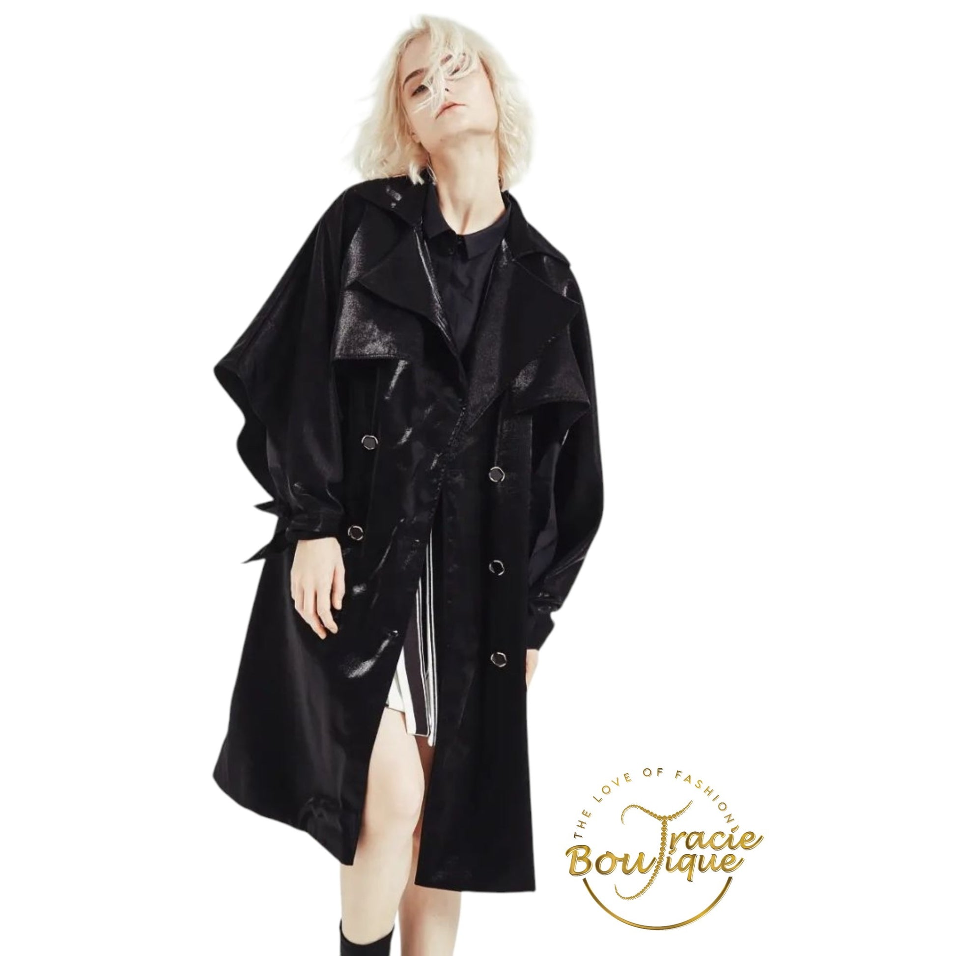 Take your outfit to the next level with our All About the Shine Coat. Made with a shiny lapel and double-breasted design, it's not your traditional coat. Its unique ties at the sleeves and opening in the arms add a touch of sophistication to any outfit, whether dressy or casual. Upgrade your wardrobe with this eye-catching piece.