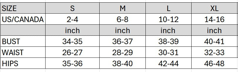 Sold in US sizes small (2-4), medium (6-8), large (10-12), and x-large (14-16)