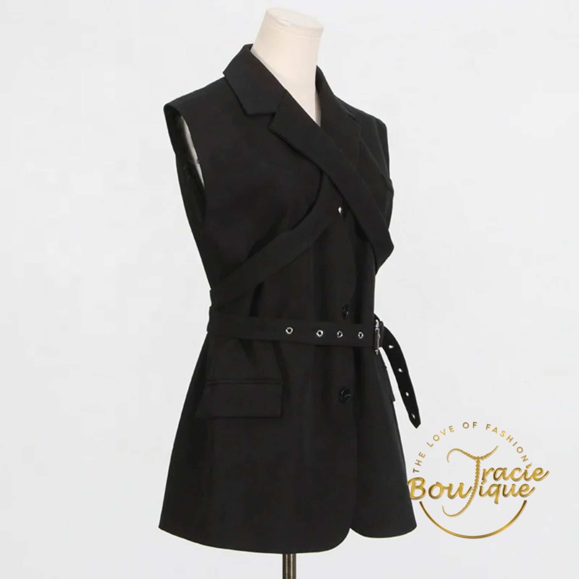 The Luxe Cross-Strap Blazer Vest combines contemporary design with timeless sophistication. This sleeveless piece features distinctive cross-strap detailing across the front, creating visual interest while maintaining a refined aesthetic. An adjustable belted waist ensures a tailored, flattering silhouette that adapts to your frame. Designed for versatility, it layers seamlessly over dresses, blouses, or tees, making it an essential addition to any elevated wardrobe. Functional pocket detailing adds practicality to its polished appeal. Perfect for transitioning from office to evening occasions with understated elegance.